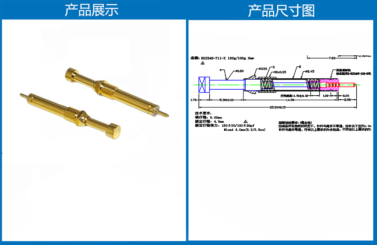 產品介紹:本產品一般用有定向作用的結束測試用,產品選用日本SK4 彈簧選用的是琴鋼線。工廠選用的材質都是比較硬的,有利于在測試的時候過大電流不會容易損壞。